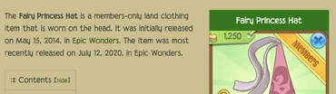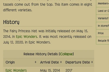 The History section is now in the process of being added to item articles. Because we staff members have been increasingly busy with school and other real life obligations, we decided to add this section to reduce the clutter on item pages and make it easier for us to do our daily updates. Similar to the Animal Jam (Play Wild) Wiki, the section uses a table to display the release information, but the table is generated with a Scribunto template that automates summary text, categories, and other formatting features. We hope that readers will find these changes useful for assessing item availability and item worth. Currently, over 25% of item articles already have the History section; if you would like to help us add this section to more item articles, please see Template:History#Adding History Section to Articles for more information.