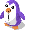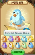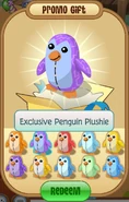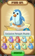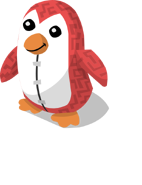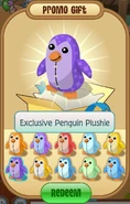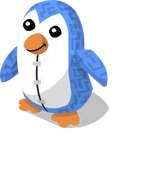The Exclusive Penguin Plushie is a large stuffed animal of a Penguin. It is standing upright with several stitches down the front and various patterns on its back. There are flat feet on the bottom and rounded flippers on the sides. It has ten different color varieties.