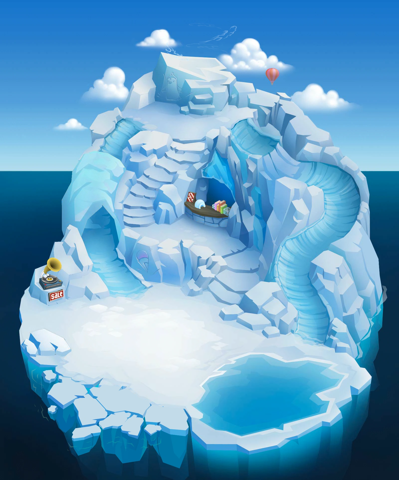 At the top of the iceberg, Jammers can ride the ice slides or stand in the wind above the penguin ice carving to chill their animal with a light blue tint. There is also a hot air balloon visible from the top of the iceberg which Jammers can click on to carry around a miniature Holdable Icon version of the balloon. This party has two shops: a music shop located at the base of the iceberg and a den item shop that can be found halfway up the ice stairs. At the bottom of the slides, there is also a snow cone ice carving that Jammers can click on to pick up a colorful snow cone Holdable Icon that can then be carried around the party. The possible snow cone colors are blue, green, red, and yellow. Near the bottom left of the iceberg, there is a small ice shelf that Jammers can walk on causing it to break apart; the more Jammers walk on it, the further it will separate, much like the bridge in Coral Canyons.
