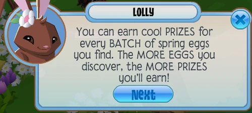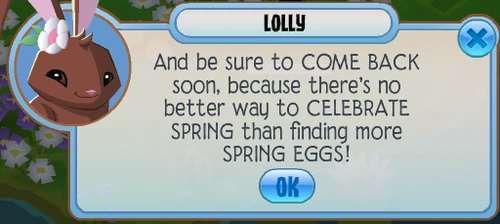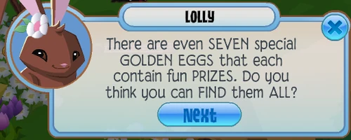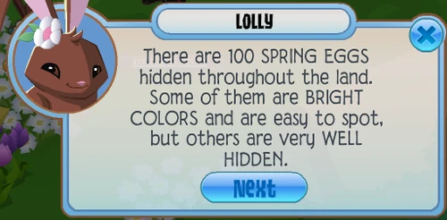 2. Lolly explains that the player's goal is to collect all of the one hundred Spring Eggs that are hidden around the adventure. She also tells the player that there are seven special Golden Eggs that offer other prizes.