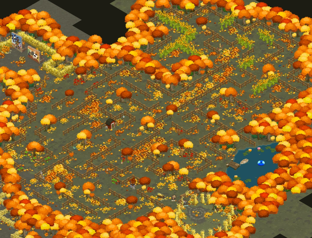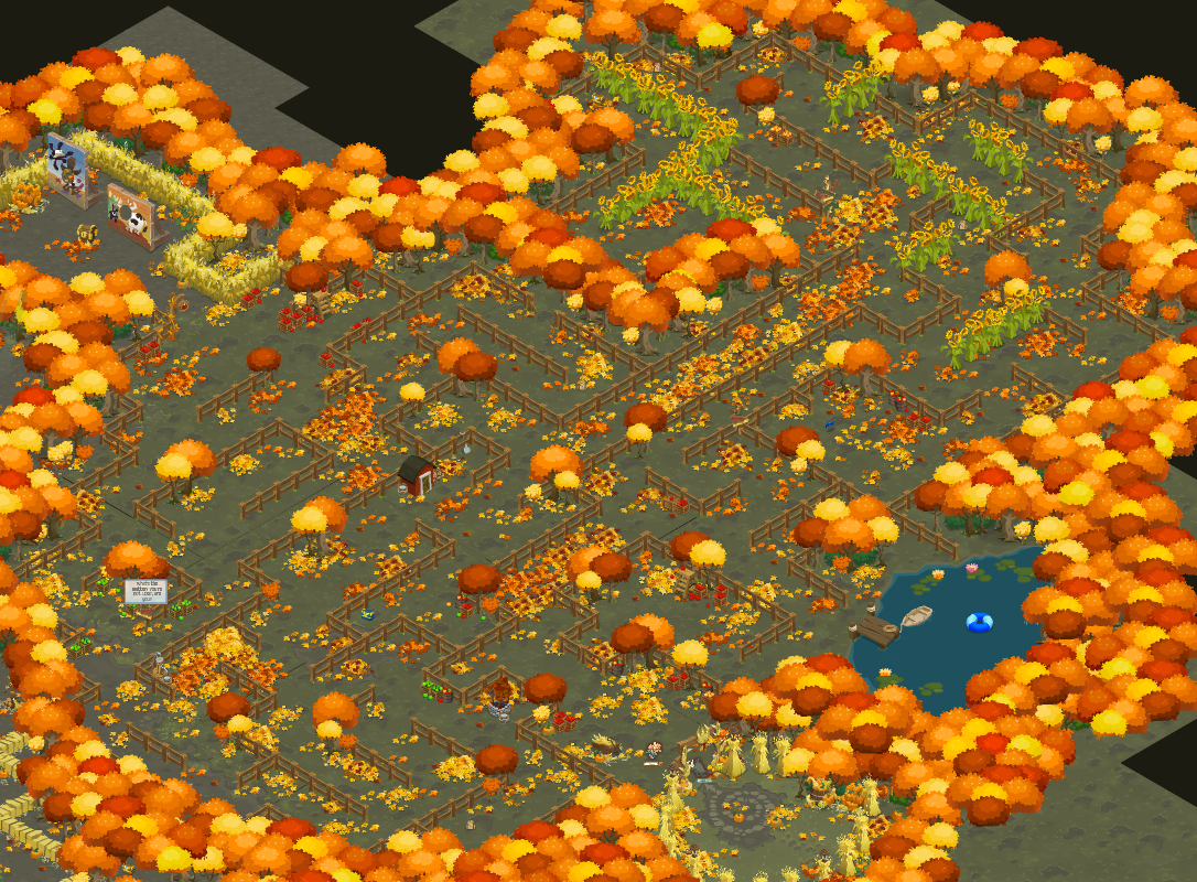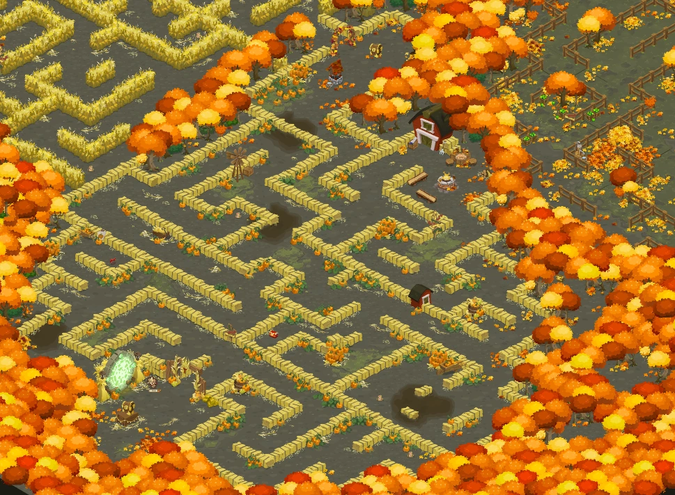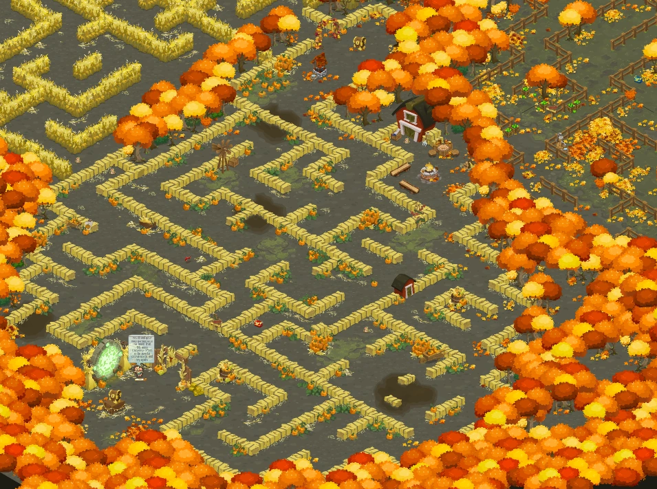 The hay bale section starts off with a plain hedge, the corn row section starts off going under an Autumn Archway, and the fence and sunflower section starts off going under an Autumn Archway with two Cornstalk Lanterns on the side of the archway. Each section has three different versions and can change each time the Adventure is played, resulting in a total of 27 unique maze combinations.